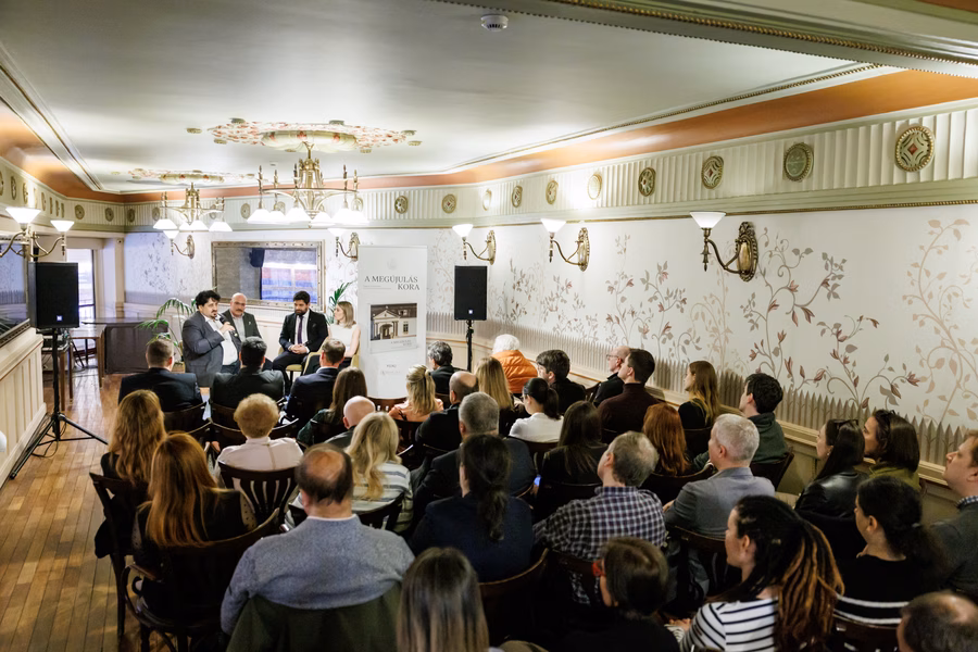 Az esemény kerekasztal-beszélgetéssel folytatódott, ahol Huber Szebasztián, a kiadásban partner Genius Loci Építészeti Alapítvány kuratóriumi elnökének moderálása mellett Szende András, A megújulás kora főszerkesztője, Meszleny Zita, A megújulás kora szerkesztője, a hely.hu főszerkesztője, valamint Megyesi Balázs műtárgyszakértő értekeztek a kötetről.