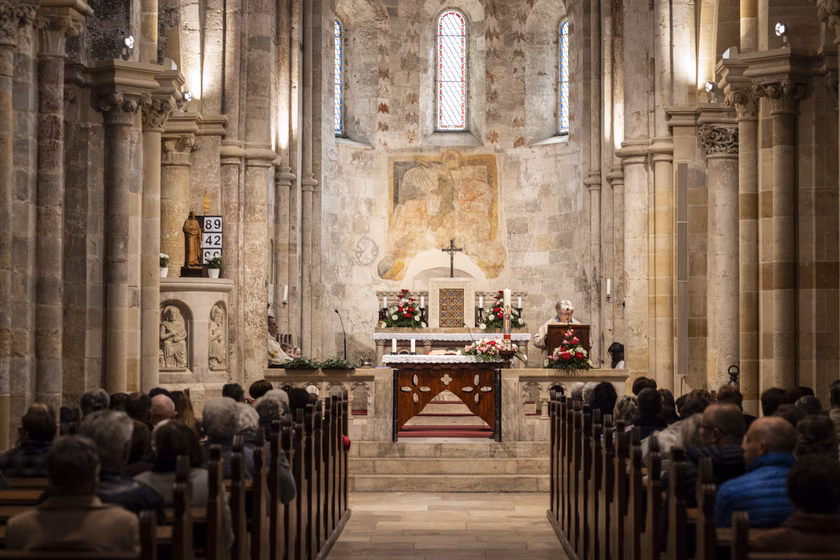 Az épületbe belépve azonnal a látogató elé tárul a háromhajós román kori templombelső hatalmas mérete.