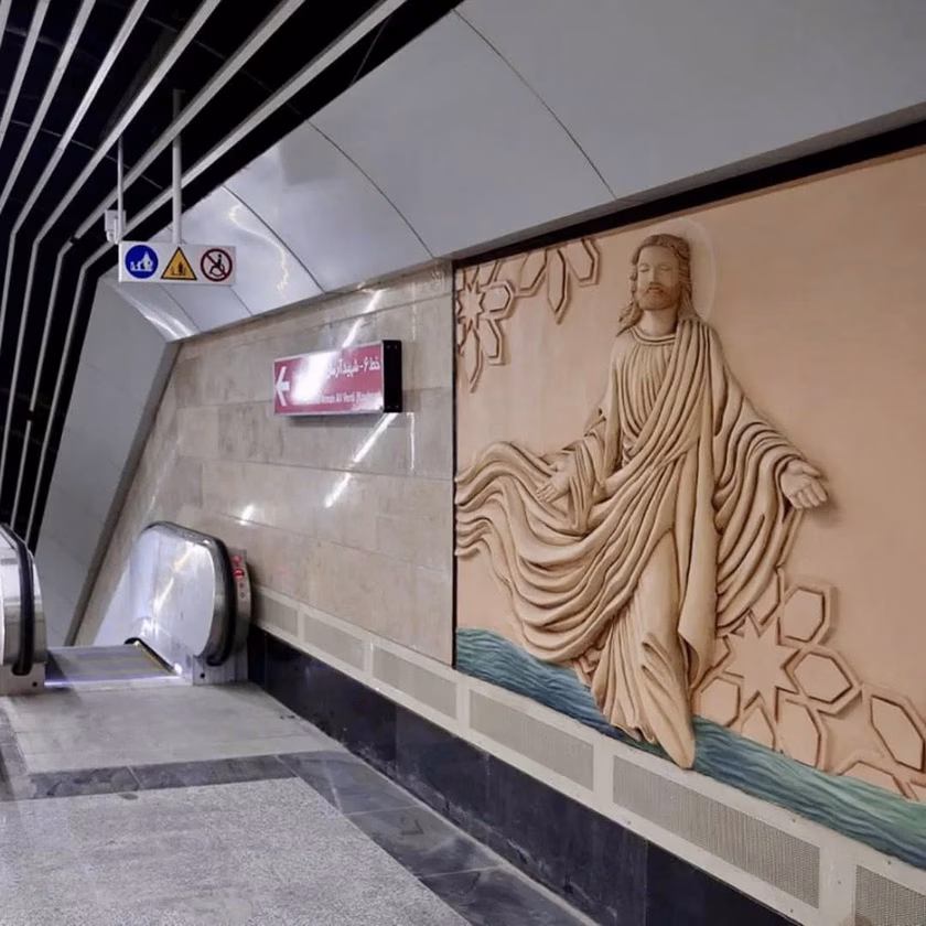 Olyan atmoszférát áraszt a megálló, amire nem kifejezetten számít az ember Irán fővárosában. A terekbe sok fény jut, jellemzőek az ívelt formák és viszonylagos csend uralkodik, így az állomás szinte maga is egy városi szentélyként hat, amely a rohanó mindennapokból kiemeli az utazót. Több helyen keresztény témájú műalkotások kaptak helyet, köztük falfestmények, domborművek és ikonográfiai elemek. A bejáratnál egy Mária-szobor is áll, és a térplasztika világoskék színei – Mária hagyományos attribútumai – több építészeti elemben is visszaköszönnek.