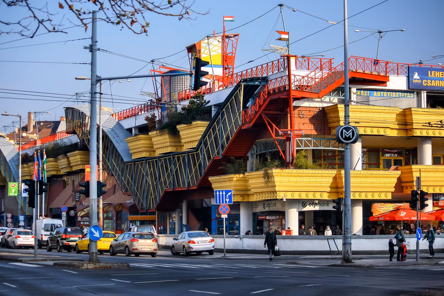 Az építészet iránt érdeklődőknek saját álláspontjuk tisztázásához kevésbé a Váci út felőli, sárga óriásbödönökkel és a belőlük kinövő fákkal, bambuszbokrokkal díszített homlokzatot ajánljuk, hanem inkább a vásárcsarnok északkeleti sarkát. Itt az épület egészen közel kerül a városhoz: a Kassák Lajos utca kezdetét két, az előző századfordulóról származó, levágott sarkú bérház jelöli ki.