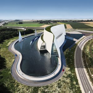 „A sztráda mentén elegánsan elnyúló épülettömeg az utazás és a haladás szimbóluma. A végtelenbe vesző forma mintha az örök igazságot idézné – a cél maga az út, amelyen a kíváncsiság hajt bennünket előre. Az épület szalagszerűen megformált tömege és nagy, plasztikus, fehér felületei messziről is hívogatóak – az épület szinte megszólítja az arra járókat.