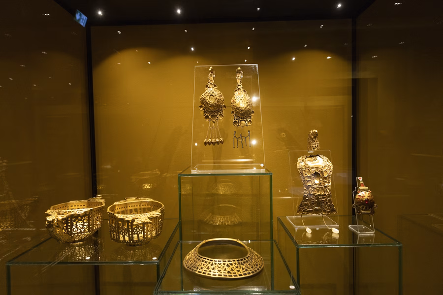 Többek között hun fegyverek, sírokban talált emberi maradványok, díszes ékszerek is megtekinthetők a vitrinekben,