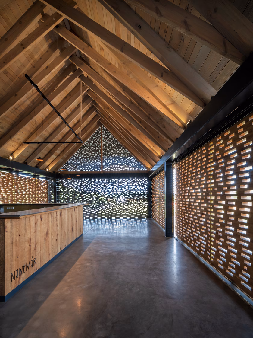 Az áttört rakott bazaltkő fal és a három részes hézagosan rakott tölgyfából álló nagy tolófal is a bent és a kint egyidőben történő megélését segítik. A beszűrődő fény sajátos, egyedi hangulatot kölcsönöz a beltérben. A tolófal kinyitásával az épület teljesen összenyitható a kültérrel, a belső tér kitágul, a belső és külső intenzív kapcsolatba kerül.