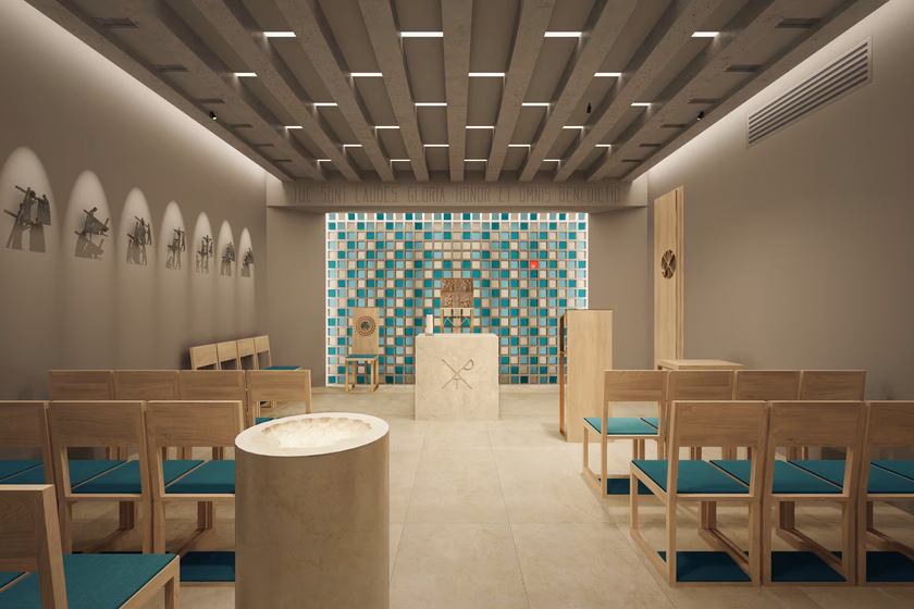 A kápolna meleg, otthonos, barlangszerű világa Assisi Szent Ferenc imádságos életére utal. A koncepció alapja a Naphimnusz, a kápolnában a teremett világra architektúrális elemek utalnak. A fa, kő és beton használata szakrális jelentéstartalommal telítődik.