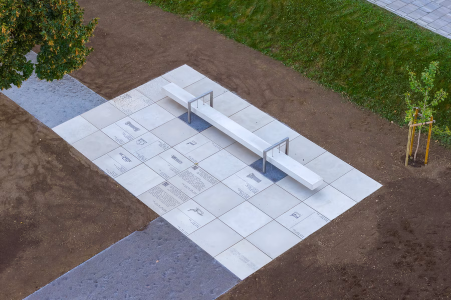 Az acélkeretben lebegő betonpad egyszerre idézi meg Breuer formavilágát és gondolkodásmódját. A betonfelületbe öntött életmű és a QR-kóddal megnyitható weboldal interaktív módon kapcsolja össze a látogatókat az építész örökségével.