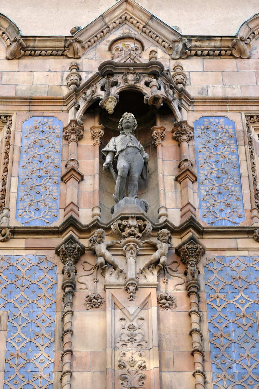 Az épület homlokzatának minden eleme a Zsolnay-gyárban készült: a „kitöltést” adó kváderkő-szerű kerámialapok, a virágmintás betétek, sőt a címerek, szobrok és nem utolsó sorban a fantasztikus tetőzet, amit a nevezetes, a teljes épülettel együtt felújításra váró lanterna, vagyis tetőbevilágító koronázott meg.