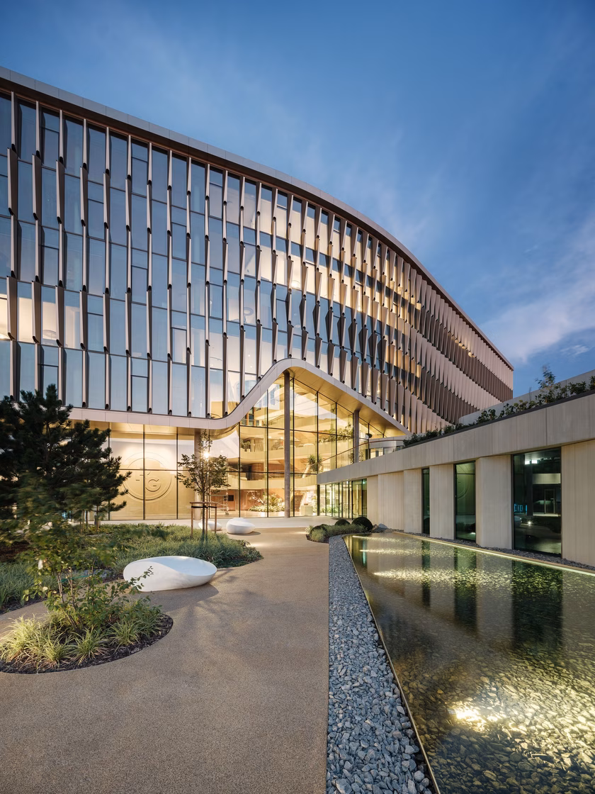 A precizitás és a városi integráció egészen másfajta megközelítését mutatja a Richter Gedeon gyógyszergyár szintén 2024-ben felavatott új budapesti irodaháza, amelyet a ZDA (Zoboki Építésziroda) tervezett. Egy olyan korban, amikor az irodaházak gyakran excentrikus üvegpalotákká válnak, ez a projekt visszafogottságával és nemes eleganciájával tűnik ki. Az építészeknek hidat kellett verniük a vállalat 125 éves tradíciója és egy modern innovációs központ követelményei között. Az eredmény egy olyan ház, amely tiszta vonalaival,