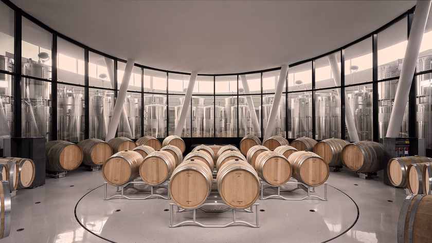 A 2024-ben befejezett projekt radikálisan szakít a rusztikus, hagyományos borászati esztétikával. A nehéz kőfalak helyett az építészek áramló geometriát alkalmaztak, amely befogadja a fényt és a tájat, miközben a funkcionális gyártási szintek láthatatlanul simulnak a domboldalba. Az épület egyik különlegessége a hatalmas, oszlop nélküli terek és a látszóbeton felületek precizitása, amely a high-tech borászati technológiát vizuálisan is alátámasztja. Ez egy bátor, már-már futurisztikus gesztus, amely azt bizonyítja, hogy a modern ipari építészet a vidéki tájban nem tájidegen elem, hanem lenyűgöző szimbiózisra képes a környezetével.