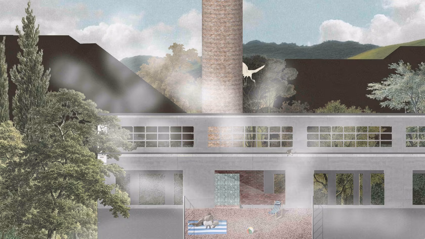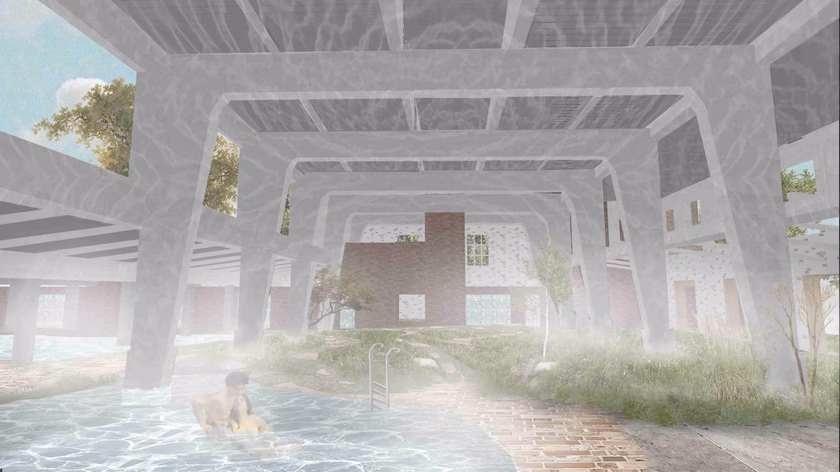 Veres Dóra, a MOME hallgatója diplomamunkájában egyszerre két problémával is foglalkozik. Miképpen lehet felpörgetni egy egyébként jó adottságokkal rendelkező település turizmusát, valamint mit lehet kezdeni egy leromlott állapotban lévő ipari épülettel? – feszegeti. Veres mindezt úgy oldja meg, hogy az egykori üveggyár komplexumában termálvizes fürdőt létesít, megteremtve ezzel a természetes és az épített környezet közötti egyensúlyt.