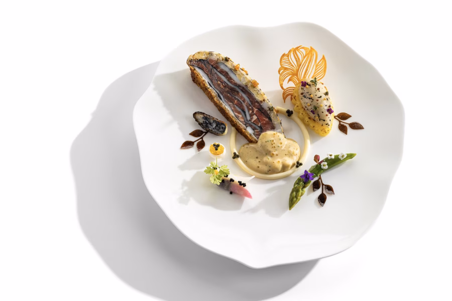 A tányértéma a Surf ’n’ Turf a magyar kertben gondolat köré épült: tintahal és marha bélszín találkozott benne, amelyet magyar füstölt sajt kapcsolt össze, citrusos jegyekkel és friss zöldfűszerekkel. A köretek a tavasz érkezését idézték meg: újburgonya, zöld spárga és karalábé jelent meg a tányéron, a magyar kertek szezonális gazdagságát és sokszínűségét hangsúlyozva.