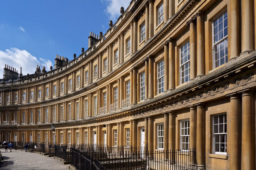 Bath ikonikus félköríves épületegyüttese, a Royal Crescent a brit városi tervezés egyik legszebb példája.