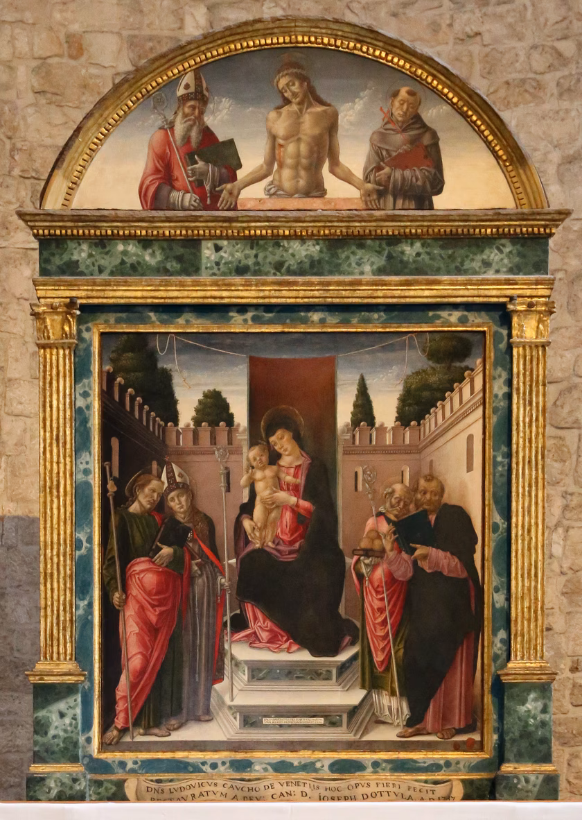 A főoltárt az úgynevezett cibórium vagy baldachin fedi: faragott oszlopai és architektonikus tagolása a pugliai és a bizánci díszítőelemeket kombinálja.