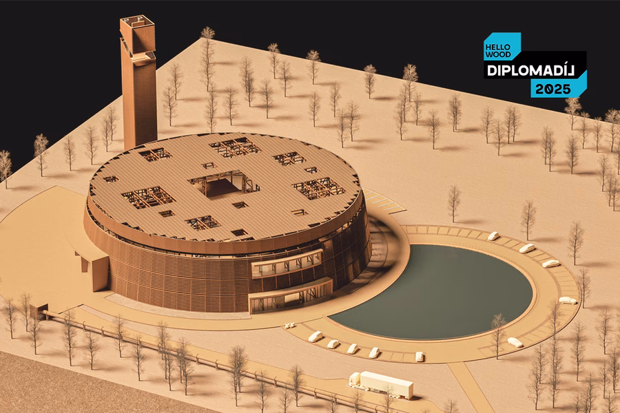 A hulladék nem szemét, hanem lehetőség – Bencze Dániel „Omega Project” című diplomamunkája ezt a gondolatot formálja épületté. A Hello Wood Diplomadíj II. helyezett terve egy olyan energiaüzem, amely a hulladékból nyert energiát körkörös rendszerben hasznosítja, miközben kutatási és oktatási központként is működik. A projekt egyszerre ipari létesítmény és szemléletformáló eszköz: a fenntarthatóságot nemcsak működésében, hanem építészeti gesztusaiban is megtestesíti.