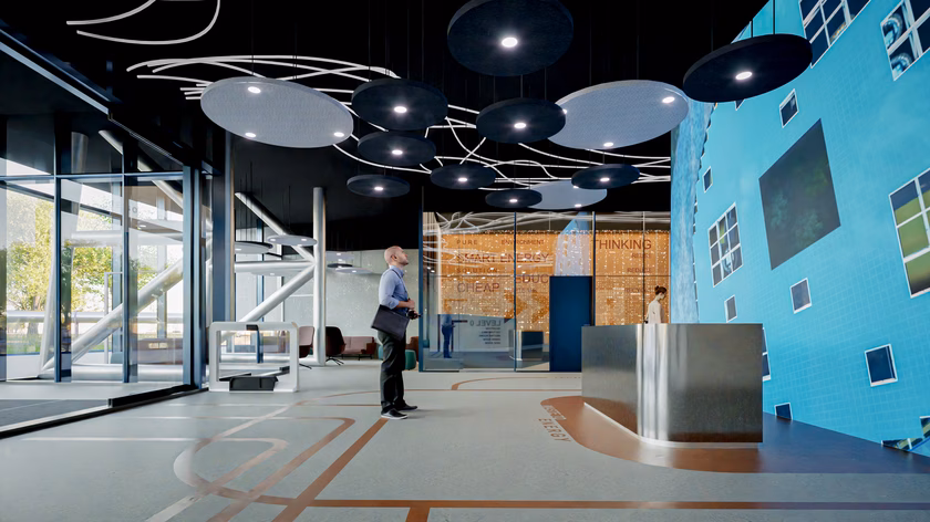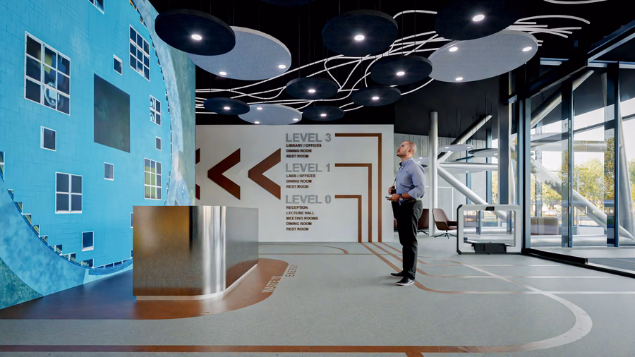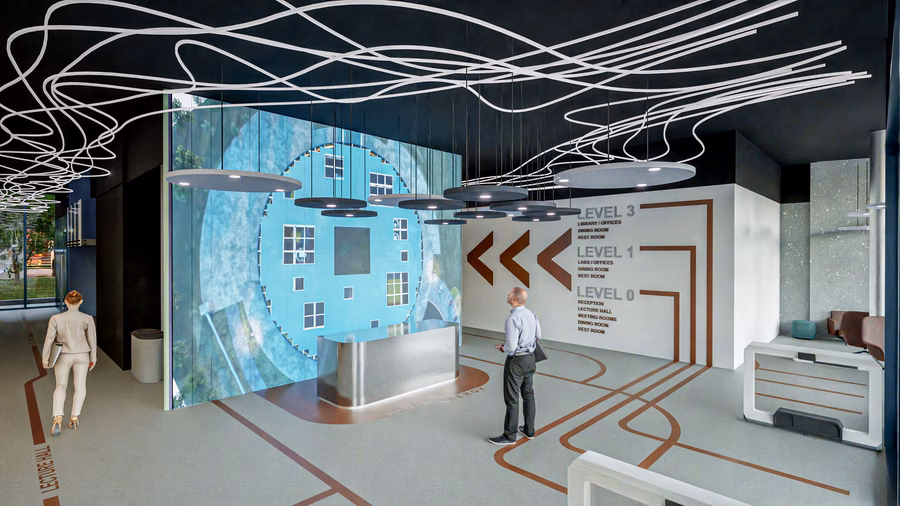 A homlokzat Renson szellőző- és akusztikus panelekből készül, ipari karaktere ellenére mégis finoman rétegzett. A szerkezet vasbeton alapra épül, amelyet acél rácsostartók koronáznak. A tetőt 4000 négyzetméternyi napelem borítja – a Sonnenstromfabrik átlátszó moduljai nemcsak energiát termelnek, hanem fényáteresztésükkel különleges atmoszférát is teremtenek a belső terekben. A belsőépítészet az ipari design nyelvét beszéli, nyers felületek, látszó szerkezetek, technológiai transzparencia jellemzi. Az épületben a technológia látvánnyá válik, a működés esztétikai értelmet nyer.