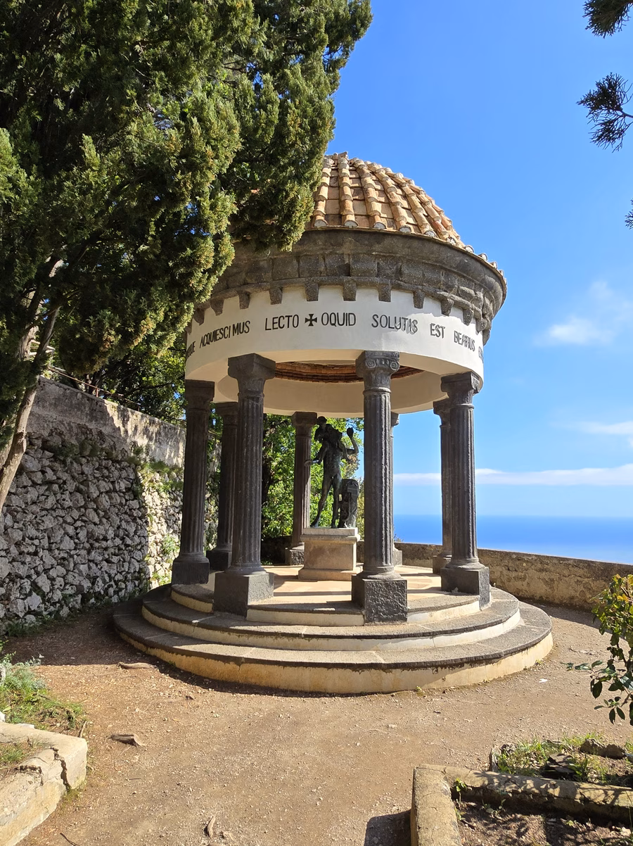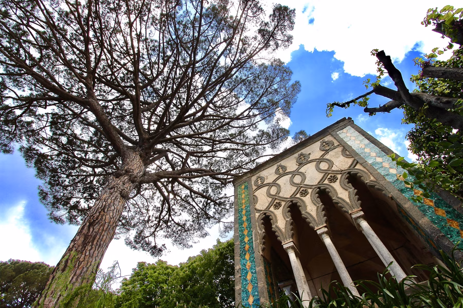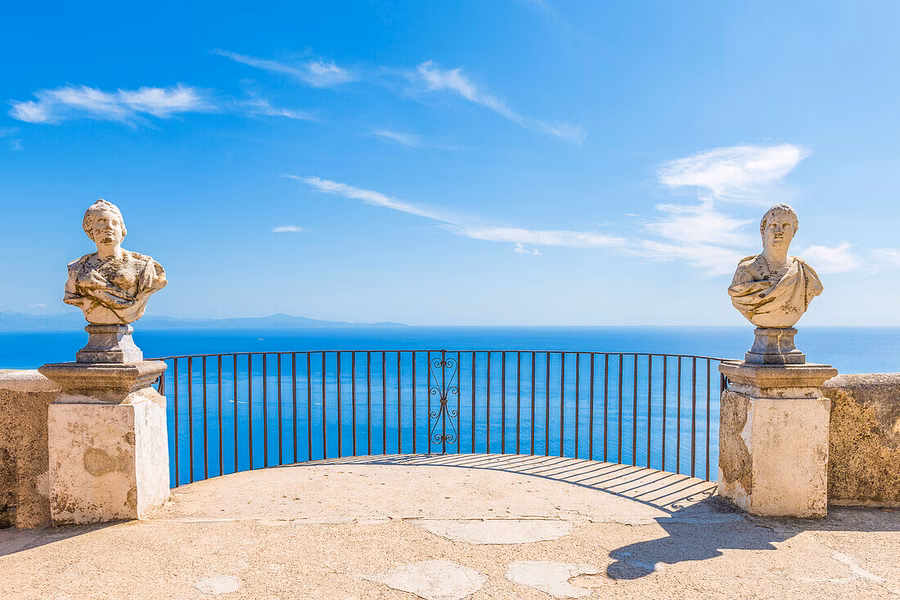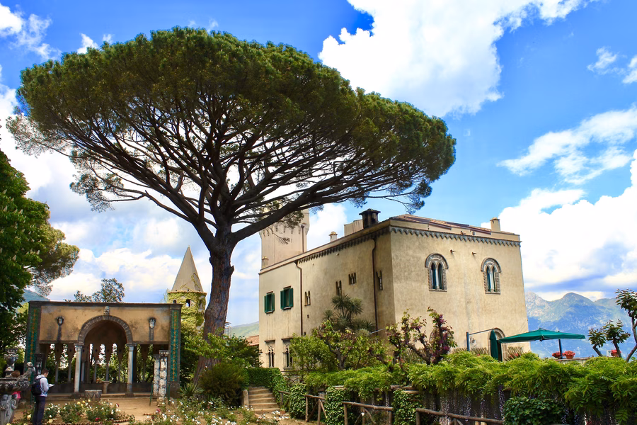 Az Amalfi-part – nem túlzás ezt állítani – a világ egyik legszebb helye. Az azúrkék tengerből szinte falszerűen kiemelkedő hegyek tövében megbúvó festői városkák alkotta partvidék már a rómaiak idején is kedvelt nyaralóhely volt. Az egyik meredek sziklatetőn állt a Ravello városa melletti Cimbronium nevű erdő, ahol később, a 11. században az Acconciajoco család udvarháza épült fel, ami később a Fuco, a Pitti, majd a Sasso dinasztiákhoz került. A 19. század elején az Atraniból származó Amici családhoz került, akik elkezdték a kertek kiépítését, többek között ekkor épült a tenger felett majdnem négyszáz méter magasan húzódó sziklafal pereme mentén a lenyűgöző Terrazza dell'Infinito, vagyis a Végtelenség Terasza.