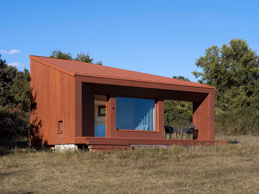 A másik Forbát-díjas, Sztrányák Gergely által tervezett erdőszéli kabin a Mecsek nyugati szélén, egy domboldalban bújik meg.