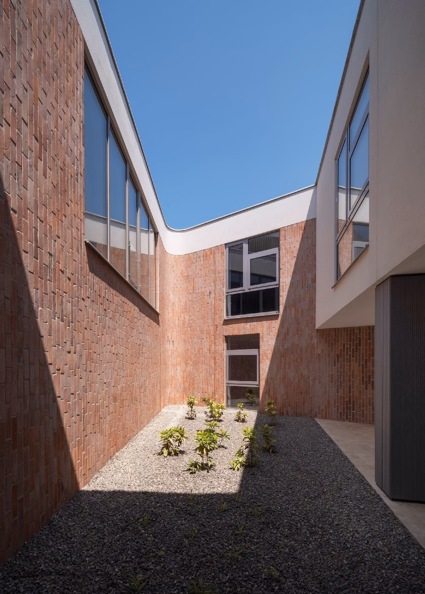 Az egyemeletes, szélforgóra emlékeztető alaprajz egyszerre praktikus és szimbolikus: a középpontban elhelyezett közösségi mag köré szerveződő szárnyak a fény és a táj felé nyitnak.