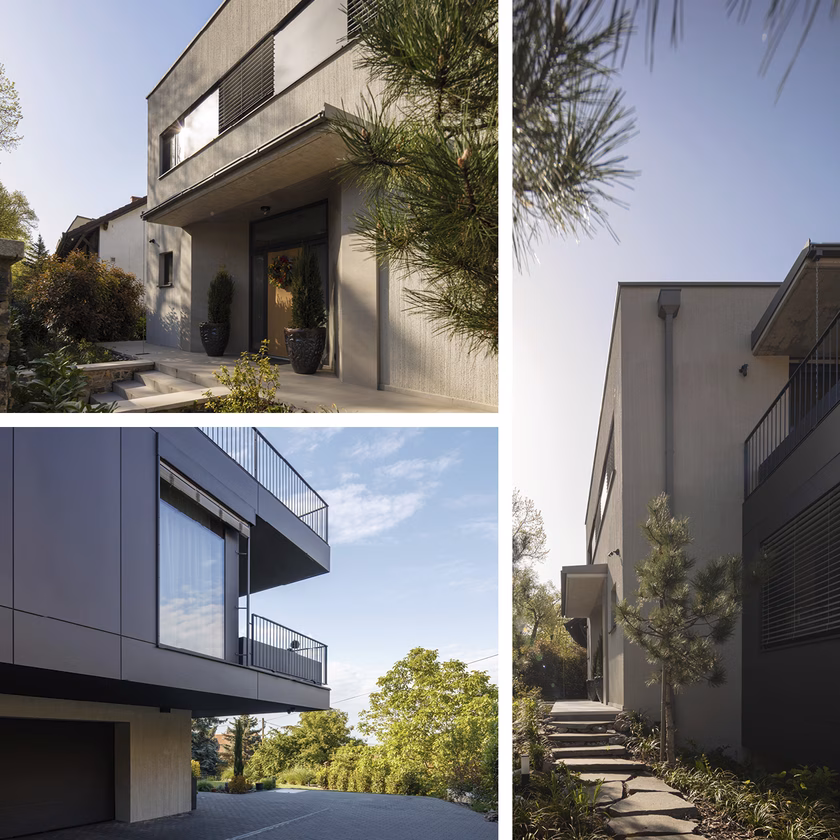 A visszafogott, arányos tömeg, a homokszínű vakolat és a látszóbeton elemek együttese elegáns, időtálló megjelenést ad a háznak.