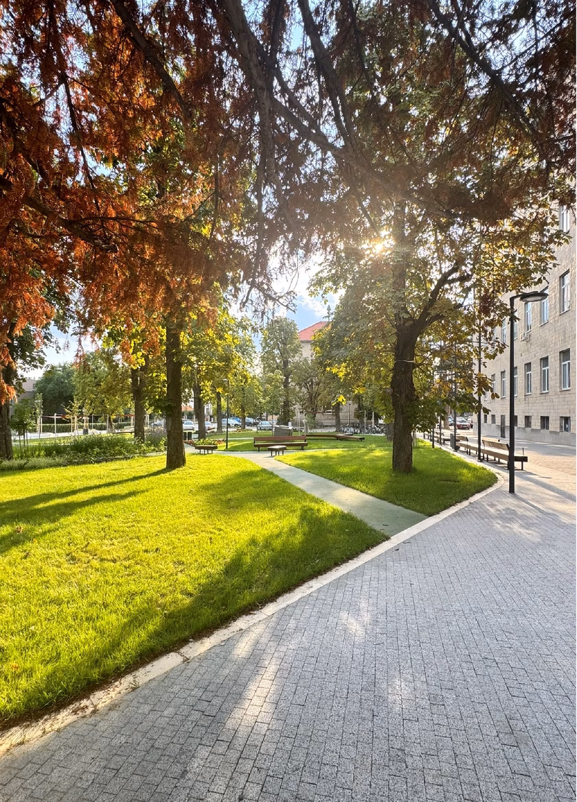 Az új park egyszerre előtér, átmeneti tér és pihenőhely, amely finoman kapcsolja össze az egyetemi épületeket a közterülettel. A burkolatok, utcabútorok és művészeti elemek igényes megfogalmazása barátságos, közösségteremtő atmoszférát hozott létre.