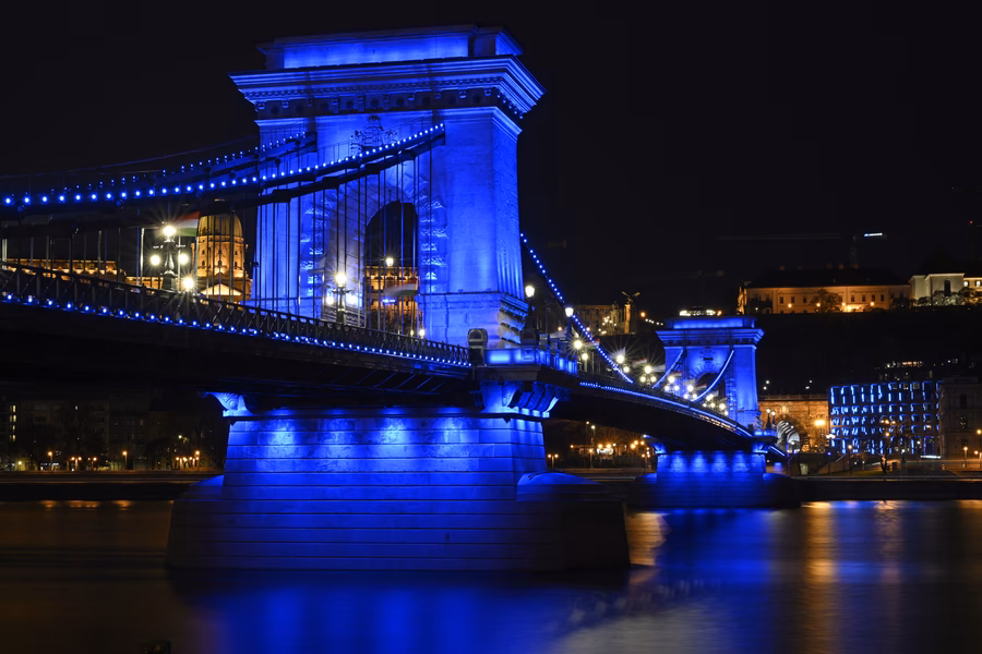 Nyitókép: Az autizmus világnapja alkalmából kék fénnyel megvilágított Lánchíd 2025. április 2-án. MTI/Lakatos Péter