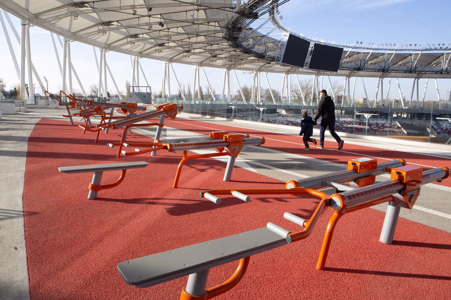 A stadion esetében ez az emelkedett szemlélet különösen érezhető: a szerkezet monumentális, mégis könnyed; a városi szövetbe illeszkedve egyaránt szolgálja a nemzetközi sporteseményeket és a hétköznapi rekreációt. A terület nyitott, sportparkként is működik, így a városlakók számára nemcsak stadion, hanem élhető közösségi tér is született.