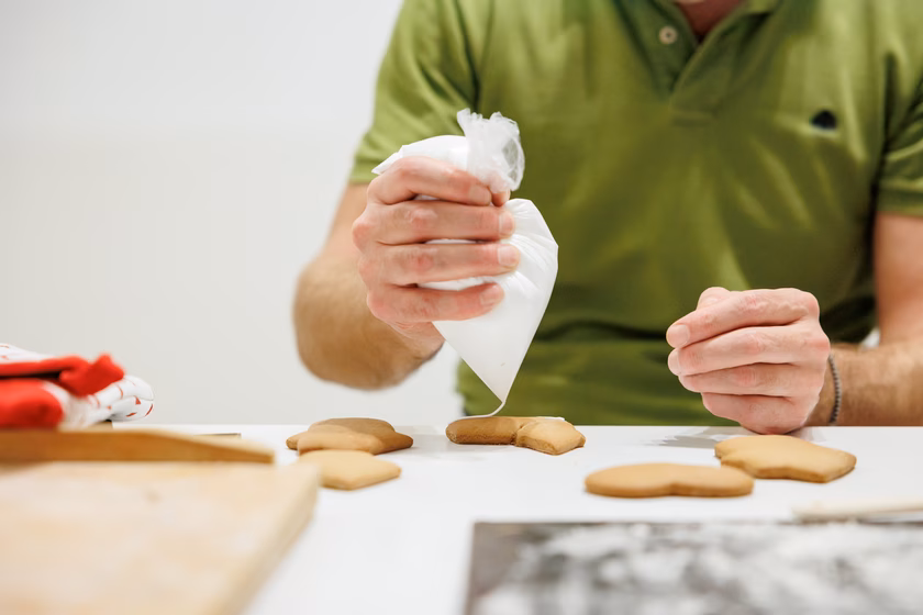 A porcukrot kétszer átszitáljuk, adagoláshoz előkészítünk egy evőkanalat. Szétválasztjuk a két tojást. A zacskót a bögrébe tesszük, kis gallért alakítva ki a bögre szájánál. A tojásfehérjét felverjük, míg fejjel lefele sem esik ki az edényből, majd lassan adagolva a porcukrot hozzákeverjük. Fontos, hogy a mixer a lehető leglassabb fokozaton keverjen. Ha az összes porcukor benne van, még keverjük fél percig. Spatulával vagy kanállal óvatosan a zacskóba kotorjuk a mázat, aztán kivesszük a zacskót, az aljára masszírozzuk a mázat, csomót kötünk rá, a lehető legkevesebb levegőt hagyva benne. A zacskó csücskén egy egészen kis lyukat vágunk egy jó éles ollóval, és már írókázhatunk is.