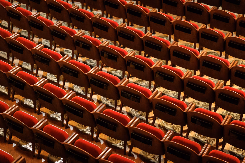 A főlépcső másik ágán az épület szívébe, a patkó alakú, háromemeletes nézőtérre érkezünk. A zsöllye, illetve a földszinti páholyok fölött két további páholysor, valamint az oszlopokkal tagolt kakasülő kapott helyet.