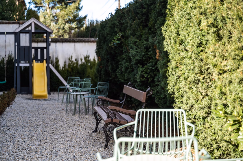 A kert eredetileg kisebb volt: a hátsó rész a lakáshoz tartozott. Mi sosem használtuk igazán, így pár éve úgy döntöttem, teljesen átalakítom. Franciaországban sokat járok tanfolyamokra, ez nem véletlen, a régi magyar cukrászaton érezhető a francia hatás, és nagyon szeretem a párizsi kerteket, a Tuileriák kertjét, a Luxembourg parkot. Onnan jött az ötlet: kis szigetszerű növénysávok, padok és öntöttvas zöld mobil székek, amelyeket a vendég úgy rakosgat árnyékba, napra, másodmagával, nagyobb társaságban ide és oda, ahogy akar.