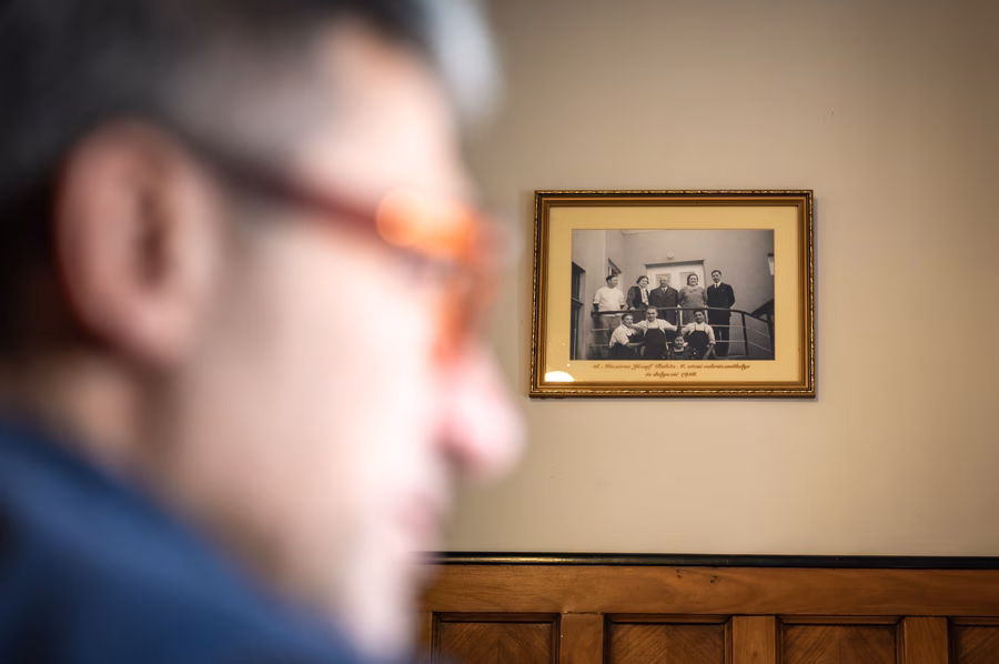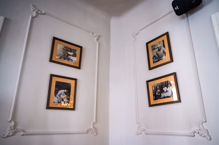 A falon lévő fotók nagyított családi képek, ezekre nagyon büszkék vagyunk, kevés cukrászdinasztia mondhatja el magáról, hogy száz éve, megszakítás nélkül működik, és mindig családi kézben maradt. Budapestnek persze vannak nagy múltú cukrászdái, de Szombathelyen nagyon kevés ilyen hely van. A szekrény az otthonosság miatt fontos, a vitrinben korábban például menyasszonyitorta-makett volt, most díjak, emlékek, apró tárgyak.