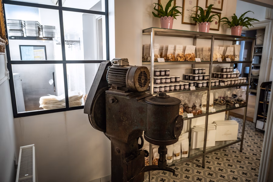 A sokadik generáció tagjai nyomják le naponta a kissé nyikorgó kilincset, pillantanak rá a bejáratnál a szinte muzeális dagasztó és fondant-készítő gépre, majd kanalazzák a vidék legjobb gesztenyepüréjét az ódon hangulatú Thonet-székeken megpihenve, és lesik fél szemmel az üvegen át, hogyan készülnek a műhelyben a csinos bejglik vagy épp a színes macaronok. A családi vállalkozást ma az a Mészáros Gábor vezeti, aki maga is cukrász, sőt a Magyar Cukrász Ipartestület elnökségi tagja, és aki olyan tisztelettel és szenvedéllyel mesél a nagyapai örökségről, ahogy csak az elhivatott mesterek még elhivatottabb unokái tudnak.