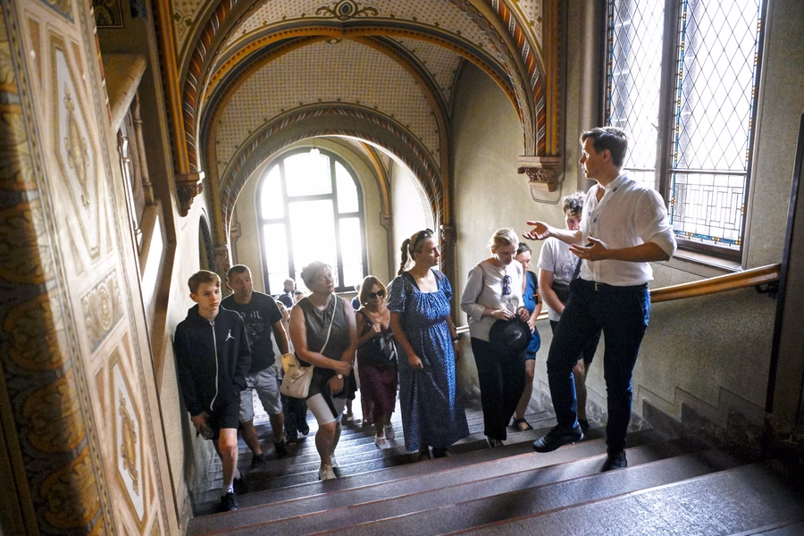 Avar Anton kurátor felhívta a figyelmet a kiállítás középső részén lévő rekonstrukciós installációra, amelynek felső részén egy címerkoszorú helyezkedik el. A tornyon egykor látható címereket Keöpeczi Sebestyén József heraldikus, címerfestő tervezte, és a pécsi Zsolnay-gyárban majolikából készültek. A címerkoszorú alatt három, a toronyból megmaradt kődarab található.