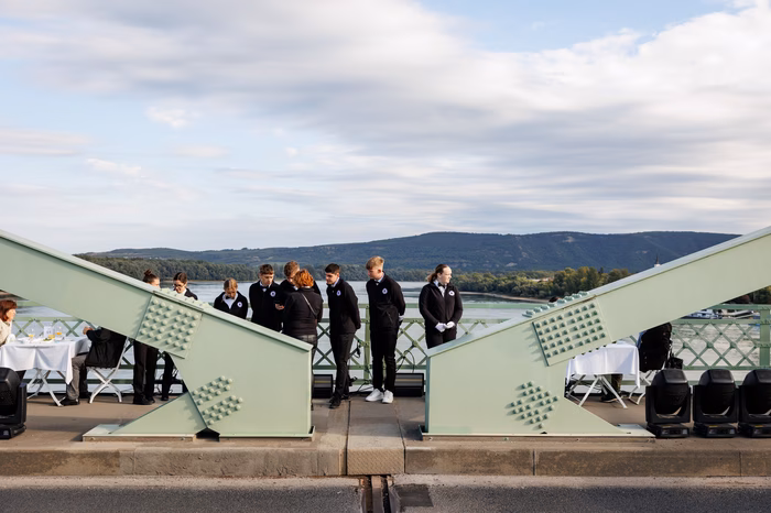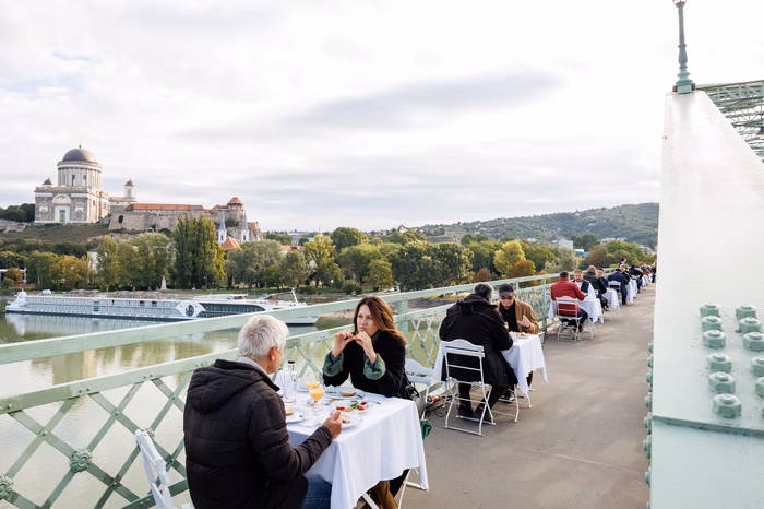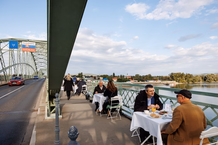 Az óra reggel fél kilencet üt, és ahogy közeledünk a Mária Valéria híd felé, a látvány is egyre élesebb. A levegő friss és csípős, a Duna békésen csillogó, a híd pedig hatalmas és tekintélyt parancsoló. A hídra lépve a látvány elképesztő. Különleges reggelihez különleges helyszín dukál. Már szemügyre vettük a helyszínt és a kilátást. Most vessünk egy pillantást a megterített asztaloknál ülő, kellemesen beszélgető lakókra. Vajon kik ők, mi vezette el őket ide? Ha a hídon reggelizel, tudnod kell, hogy a veled szemben ülő a híd túloldaláról származik. S bár a Duna két ellentétes oldalán laktok, nem csak a híd köt össze benneteket – ez a reggeli első és talán legfontosabb tanulsága. A Hídünnep keretében meghirdetett program célja, hogy közelebb hozza egymáshoz a két város kedves polgárait, a múlt és a jelen pillanatait átszövő közös pontokra irányítva a figyelmet. Hiszem és a reggeli is azt mutatja, hogy a híd ereje nemcsak a robosztus szerkezetében rejlik, hanem Esztergom és Párkány lakosainak kapcsolatán és összefogásán. ,,Nem tudtam ki lesz a párom, de nagyon jól sült el, szóval tartjuk majd a kapcsolatot!" – mesélte boldogan egy Esztergomból származó résztvevő ó, egy a 65-ből, aki nagyon buzgóan beszélgetett párkányi társával. A reggelin dolgozókról sem szabad megfeledkeznünk, akik hajnali órákban ébredve, zökkenőmentesen valósítottak meg egy életre szóló élményt. A pincérek a két város iskoláinak diákjai közül valók, mosolyukkal emelve az amúgy is napsugaras reggeli fényét. A felszolgált ételek között volt felvágott, péktermékek, lekvárok, gyümölcslevek, sajtok és még sok más. Aki kívánt, természetesen kávét is kaphatott, akárcsak teát vagy ásványvizet. ,,Mit gondol, szándékosan tették párba Önöket?” tettül fel a kérdést egy szimpatikus idősebb úrnak. „Határozottan igen, aminek nagyon örülök!” – érkezett a választ. A rövid beszélgetésből azt is megtudtuk, hogy a reggelire való jelentkezés pár kérdéses regisztrációhoz volt kötve, így a szervezők kedves turpisságának is köszönhető, hogy az asztaltársaságok könnyen megtalálták a közös hangot. A program vége felé érkezve még mindig javában folyt az asztalok fölötti, jóízű beszélgetés, és úgy tűnt, soha nem is ér véget. A hídnak hála pedig nem is kell, hogy befejeződjön.