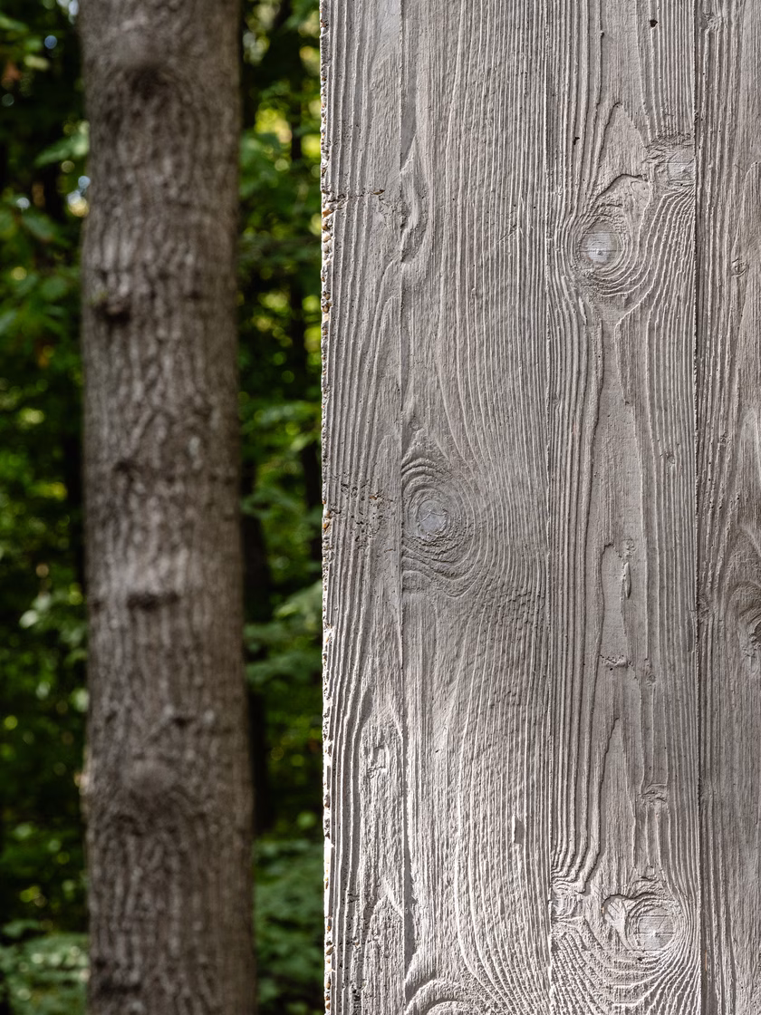 A ház a megmunkált, de mégsem túlszabályozott kert végében helyezkedik el, mögötte már az erdő húzódik. Aki ránéz az épületre, annak valószínűleg a karakteres kéményen akad meg a szeme. Ennek az aljában szabadtéri kandalló kapott helyet, így a tágas terasz ősszel és télen is funkciót kaphat, emellett a monolit vasbeton elem szoborszerű fókuszpontot is ad a lapos épületnek.