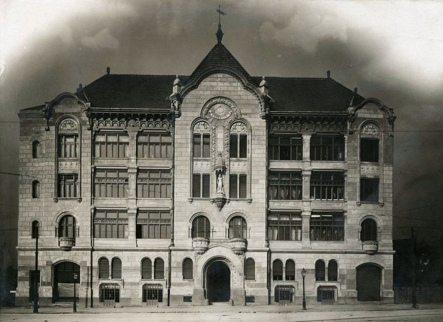 amit télikert-szerű homlokzata tett egyeidvé. A ház, pontosabban bal fele súlyosan megsérült a harcok során, ezért felemás módon épült újjá. A városkép egységessége érdekében magasságát tekintve a két világháború között épült szomszédjához illeszkedik, de az összhatás mindenképpen furcsa, amire csak a ház történetének ismerete ad magyarázatot.