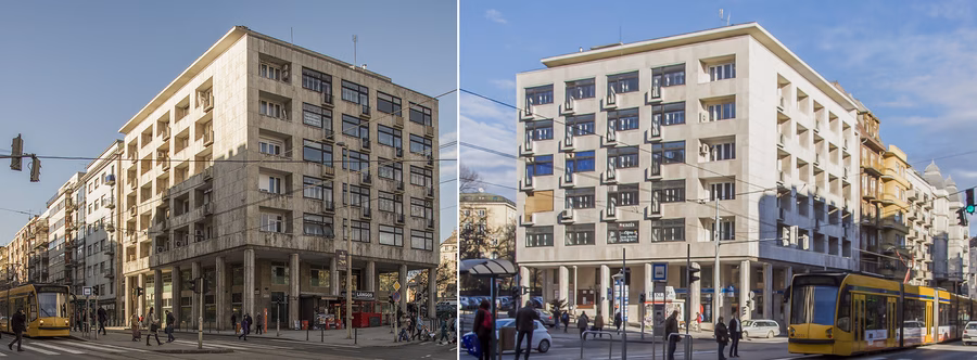Az útkereszteződés másik oldalán álló neoreneszánsz bérpalota is kiégett, így évekig egy kettős foghíj állt a városképileg-városszerkezetileg kiemelt helyen. A forradalom utáni újjáépítés során került sor a helyzet rendezésére, ekkor épült fel Dúl Dezső (BUVÁTI) tervei szerint a ma látható iker-épület. A tervek még az 1950-es évek elején, szocreál stílusban készültek, de Sztálin halála, illetve az azt követő Hruscsov-beszéd miatt átdolgozták a rajzokat. Az építkezés épp a forradalom miatt húzódott, végül 1960-ra fejezték be a projektet. Az elegáns, kőlapokkal burkolt, árkádos házak valóban méltó keretet adnak a Rózsadomb indításának, a „kommunista” épületek szinte észrevétlenül olvadnak bele a két háború közötti környezetbe.