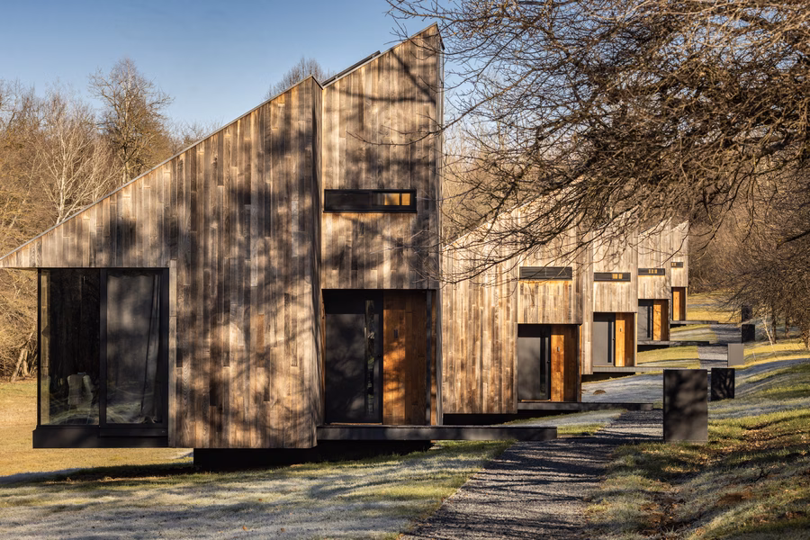 A kis, kétszemélyes épületek a természet szélén kaptak helyet, és egy mai, városi ember elvonulási igényére reflektálnak.